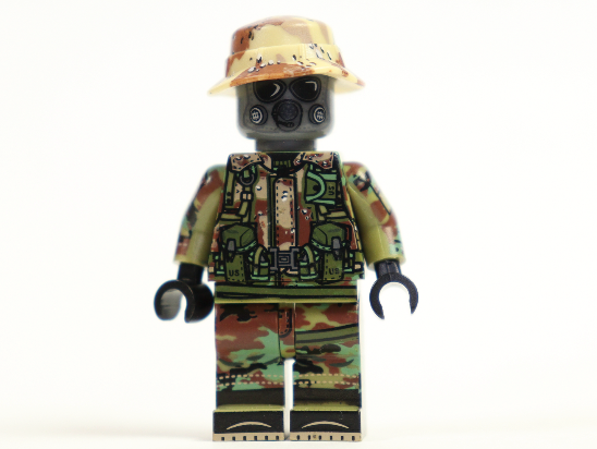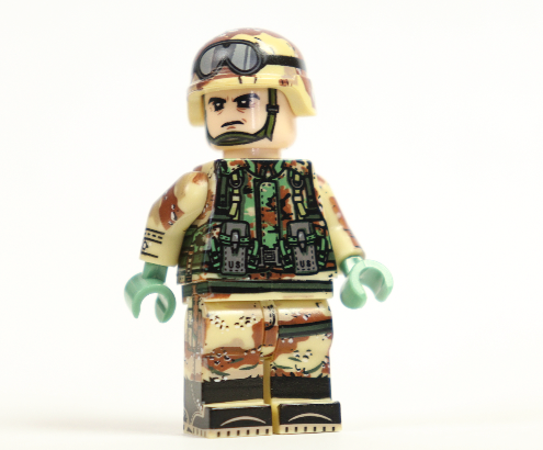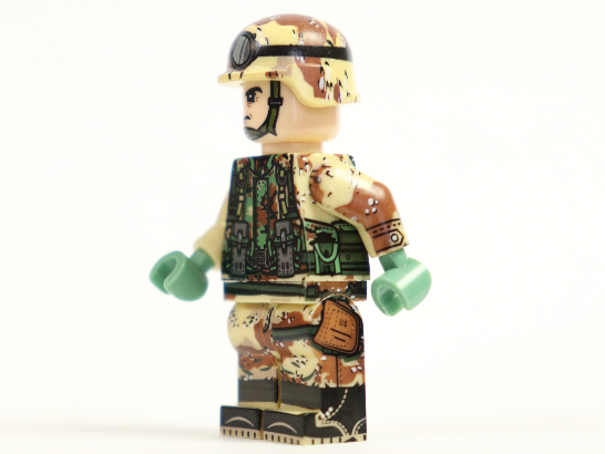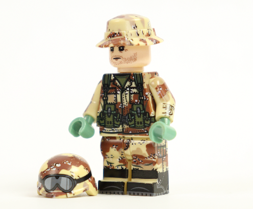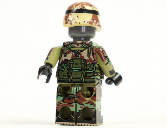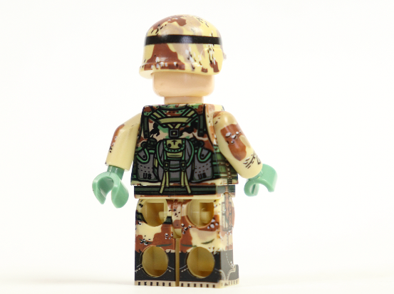 Chocolate chip camo for Iraq War - USA army, set of 3 sodliers. Each has 2 headgears. Also this set has a pack of weapons in desert camo as well.