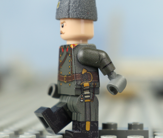 WW1, Winter period tzar army officer in great coat and winter hat. Original LEGO parts were used to make this custom minifigure. Hat is a 3D made item with custom printings. History authentic toy soldier.
