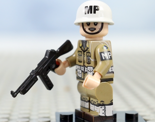 "Military Police" toy soldier goes with printed helmet and Thompson submachine gun.